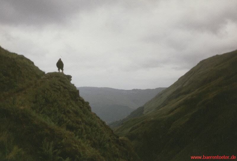 Den schottischen Überlieferungen zu folge, wuchteten die Clans die Bäume aus dem Zentralhochland bis an die Küste und holzten alle Berge bis auf den Grund ab, so dass heute kein einziger Baum mehr die Highlands bedeckt. In dieser einsamen Landschaft, wie man sie kaum noch in Europa findet, wanderten die Bärentöter fünf Tage lang und begegneten keine Menschenseele. Fernab von jeglicher Zivilisation durchquerten die Wanderer die Glens. Die wunderschöne und unberührte Landschaft und die abenteuerlichen Wege entschädigten alles und ließen den Alltag vergessen. Als die Gruppen wieder von dem Reisebus eingesammelt waren, erzählten sich die müden aber begeisterten Wanderer ihre Geschichten auf einem Pfadfindercamp inmitten internationaler Pfadfinder nahe Glasgow. An den nächsten tagen wurden Freundschaften geschlossen und Unternehmungen mit den Schotten gemacht. Unter fachlicher Anleitung lernten wir Bogenschießen und noch vieles mehr.