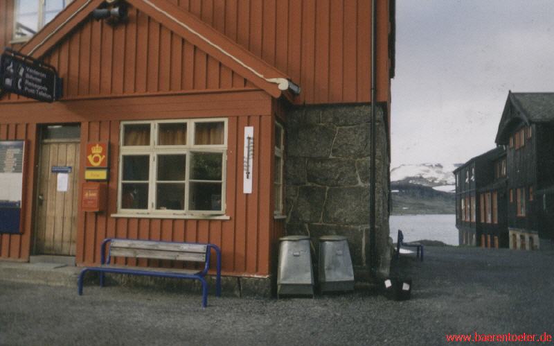 Wohl die wenigsten von uns schliefen in dieser Nacht, die wir auf dem Olsoer Campingplatz verbrachten, ruhig. Viele Gedanken über die nächsten Tage und Stunden geisterten durch unsere Köpfe und keiner war es sich gewiß, welches Abenteuer uns bevorstand. Früh am Morgen bauten wir die Kohte ab, verabschiedeten uns von den Nürnberger und Bayreuther Pfadfindern und fuhren mit dem Bus zum Hauptbahnhof. Als wir in der Bergen-Bahn Richtung Finse saßen, bestaunten wir nur noch die atemberaubende Schönheit Norwegens. Auf der ungefähr 330km langen Strecke durchquerten wir mehr als 150 Tunnels und überfuhren mehr als 250 Brücken. Sich auf dieses Abenteuer auf den Gleisen einzulassen, war für jeden von uns ein einprägsames Erlebnis. Alle Facetten der südnorwegischen Landschaft zogen an unseren Fenstern vorbei und gerne hätten wir den Zug verlassen, um in die Weite des Landes einzutauchen. Doch dies blieb uns bis Finse verwehrt. Als wir den höchsten Bahnhofs Europas (1222m) am späten Nachmittag erreichten, freuten wir uns auf die nächsten 6 Wandertage in dem herrlichen Gebiet. Beim Verlassen des Zuges wurde unser Tatendrang schnell von der eisigen Kälte gebremst. Bei 8°C mitten im Hochsommer ist es uns nun vollkommen klar, warum eins Polarforscher Amundsen und Scott ihre Ausrüstung hier getestet haben. Nun standen wir irgendwo auf einem gottverlassenen Bahnhof bei eisiger Kälte. Zu unserem Glück fing es auch gleich an zu Schneien. Angesichts dieser menschenfeindlichen Bedingungen verschlug es uns sogleich in das warme Bahnhofswartezimmer, daß uns auch ein wenig Schutz versprach.