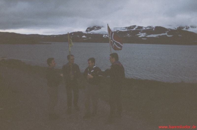 Als es dämmerte, erreichten wir die malerische Ortschaft Flam. Das Jedermannsrecht in den Skandinavischen Ländern konnten wir uns nun auch erklären ... Überall, wo eine Möglichkeit des Übernachtens lockte, war das Betreten durch Zäune verwehrt. Auch außerhalb der Ortsschaft war es aufgrund der steilen Abhänge nicht möglich einen geeigneten Schlafplatz zu finden. Etwas entmutigt schleifen wir dennoch auf dem Campingplatz schnell ein. Tief & fest schlummerten wir in die Morgenstunden hinein. Nach dem Frühstück frischten wir unser Essensvorrat wieder auf und wanderten frohen Mutes nach Auerland. Nun bemerkten auch wir, daß Flam ein reiner Touristenort ist. Nicht nur, daß hunderte von Menschen von hier aus eine Schiffsrundreise wagten, sondern, daß wir auch häufig von knipsenden Urlaubern umlagert waren, brachte uns die Erkenntnis, daß Pfadfinder in Nrowegen eine Seltenheit sind und damit eine Sehenswürdigkeit darstellen. Unser Freund FubU erwähnte „Jungs, ich glaube nächstes Jahr können wir uns auf einer Postkarte bewundern" - Ob dies stimmt, werden wir nicht nachprüfen können. Unsere Mittagsrast legten wir an dem schönen Auerlandsfjord ein und genossen die herrliche Mittagssonne. Hinteru ns erblickten wir immer noch die Gletscher, von denen wir einst aufbrachen. In einer Bucht vor uns erspähten auch einige den kleinen Fischerort Auerland. Gestärkt ereichten wir nach einem Marsch unser Tagesziel.