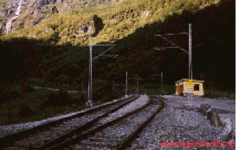 Die Befürchtung in der Nacht von dem Bahnhofswärter unsanft geweckt zu werden und die ungewohnten Nordlichter liesen uns nicht zur gewünschten Ruhe kommen. Doch früh am Morgen brachen wir unser Nachtlager ab und nahmen den ersten Zug in Richtung Myrdal. Von Myrdal wollten wir entlang der Flamdalen bis auf das 3m über dem Meeresspiegel gelegene Auerland wandern. In Myrdal weckten die ersten Sonnenstrahlen usnere Begeisterung an der nun folgenden Wanderung. Wir überquerten unzählige Brücken, bestaunten die klaren Gebirgsbäche, die sich ihren Weg durch da schroffe Granit bahnen. Links und rechts stürzen riesige zu Wasserfällen geworderne Wassermassen aus dem Gletschergebiet herunter und eröffneten unsere Gruppe ein imposantes Spektakel. Auf der Hälfte des Abstiegs von 1092m herab legten wir eine verdiente Rast ein. Unser Koch Markus H. machte sich sogleich auf die Wassersuche undkamn nach wenigen Minuten aufgeregt zurück, da er einen mysteriösen alen Höhleneingang in das Bergmassiv gefunden hatte. Schnell war die Begeisterung, eine Höhlenerkundung zu unternehmen auf die restlichen Jungs übergesprungen. Ausgerüstet mit einem Seil und Lampe betraten wir die dunkle Öffnung. Die Erkundung brachte die Erkenntnis, daß der Tunnel ein alter Versorgungsschacht der Bahnarbeiter aus dem vorherigen Jahrhundert ist. Nach der interessanten Exkursion in das Bergmassiv rasteten wir kurz an eineM Wasserfall. Nun wanderten wir tiefer in das Tal hinein, daß uns desöfteren an Bildern der Kanadischen landschaft erinnert .Am frühen Nachmittag entdeckte Michael einen geeigneten Platz für unsere Mittagspause. So lag die Wiese idylisch gelegen an einem Wildbach, der für das Kochen unerläßlich war.