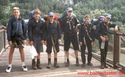 Da sie uns (dank unserer Kluft) sofort als Pfadfinder erkannten, durften wir natürlich die erste Nacht dort verbringen. Am nächsten Morgen ging es auch schon gleich mit den Kanus los. Nach mehreren Irrfahrten in die Flora und Fauna (sprich: in den Uferbereich der Altmühl) schafften wir es doch unseren Kurs in der Mitte des Flusses zu behalten und kamen recht schnell voran. Angespornt von der Idee das Tüchtigkeitsprobenabzeichen „Kanufahrer“ zu bestehen, versuchten wir 100km mit dem Kanu in drei Tagen zurückzulegen. Eine Aufgabe, die so manches Opfer (wie z.B. um 06:30 Uhr Aufstehen) erforderte, aber dennoch der gesamten Gruppe Spaß bereitete. Spaß machten auch die Bootsrutschen, bei denen wir mit hoher Geschwindigkeit die Altmühl hinuntersausten – ein nasses Boot nahm man da gerne in Kauf!