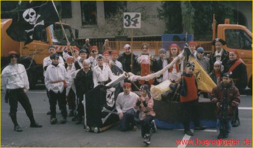 Unter dem Motto "Die Piraten sind los" war unsere Teilnahme geplant, und so schneiderten die Wölflinge und Pfadfinder fließig an ihren Kostümen und mit der Hilfe von so mancher Mutter war der Piratenroch und die Verkleidung perfekt. Gleichzeitig lief nach Bauanstrengungen einige Tage vor Faschingssonntag unser Piratenschiff von der Bärentöterwerf. Als es dann Faschingssonntag war, und wir die Piraten unserern Freibeuterzug beginnen konnten, versammelten sich insgesamt 32 Piraten um die Räuberhöhle.