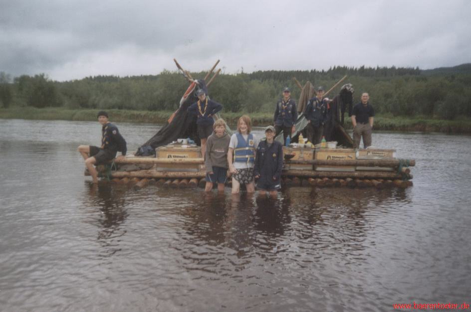 Mit dem Wochenendticket ging es dann von Aschaffenburg nach Rostock, wo wir gleich in die Fähre „Huckleberry Finn“ einschifften und uns im Aufenthaltsbereich der Fähre mit Schlafsack und Isomatte für die Nachtfährfahrt gemütlich machten. Mit Bus & Bahn fuhren wir zum ersten Ziel unseres 2-wöchigen Abenteuers: Gunnerud. Denn hier zeigten uns mehrere nette Mädels einer Floßbaufirma, wie man ein Floß baut. Und da neun Pfadfinderinnen und Pfadfinder nicht auf ein Floß passen, bauten wir gleich zwei Flösse. Bei strömenden Regen rollten wir rund 3 Meter lange Stangen ins Wasser und verknoteten diese dann – unter Anleitung der schwedischen Mädels – zu zwei Flößen.