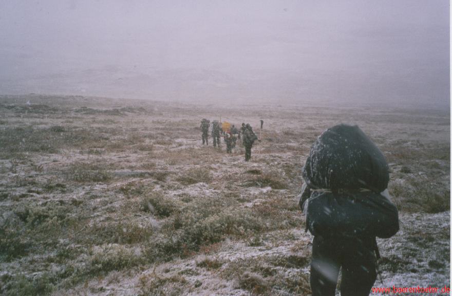 Wenn man sich vorstellt, dass man 100km lang laufen muss, um wieder auf Zivilisation zu treffen, merkt man wie klein man eigentlich ist. Die Nächte verbrachten wir zum Teil in selbstgebauten Poncho-Kothen-Konstruktionen, am wärmenden Kothenfeuer und in einfachen Schutzhütten am Wegesrand. Während der Wanderung konnten wir gleich zwei Jahrszeiten erleben. Zu Beginn unserer Wanderung färbten sich die Blätter gold-gelb, einige Tage später wurden wir von einem Schneesturm überrascht und wanderten mehrere Tage durch ein wunderschönes weißes Lappland. Weitere Fotos von der Fahrt findet Ihr in der Fotogalerie. Die digitalisierte Fahrtenchronik wird - sobald sie fertig geschrieben ist - auf unserer Homepage veröffentlicht.